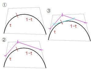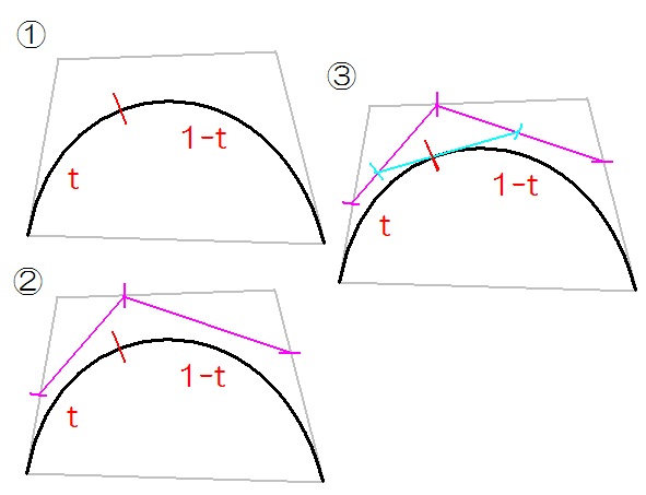 曲線を t : 1-t に分割したければ、 制御点 1-2, 2-3, 3-4 を t : 1-t に分割し、 それを結んで出来た2本の直線を、再び t : 1-t に分割し、 残りの1本を t : 1-t に分割する。