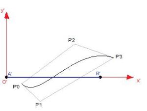 この座標系で、ベジエ曲線の y座標の式は、直線との距離を意味し、 x座標の式は、最も近い直線上の位置を意味する。