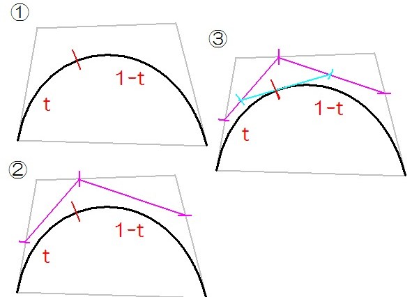 ベジエ曲線は、好きなところで2つのベジエ曲線に分割できる。 曲線を t : 1- … 続きを読む 7:ベジェ曲線の分割